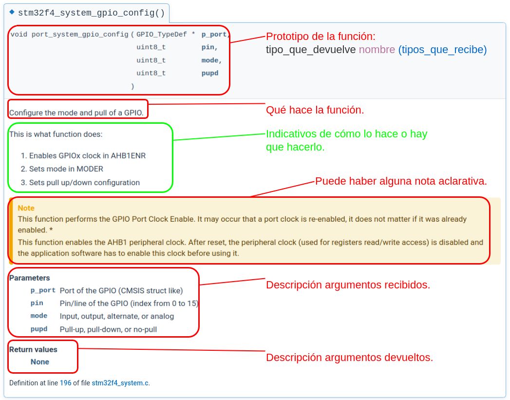 Esta función configura el modo de la GPIO: entrada, salida o función alternativa, y el tipo de conexión a la que está el pin (conectada a resistencias de pull-up, o de pull-down). Sirva este primer punto para establecer las bases de cómo se codifican las funciones. Tengamos a mano la entrada de la API. La figura muestra la descripción de la anatomía de una entrada de la API.