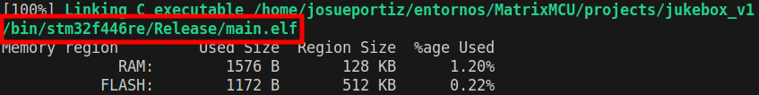 Podemos comprobar que el programa sigue compilando correctamente y viendo que se ha generado el fichero ejecutable .elf en la carpeta bin, donde se guardan los binarios generados a ejecutar por el microcontrolador. Tendremos un mensaje en la terminal similar al que se muestra en la figura de compilación.