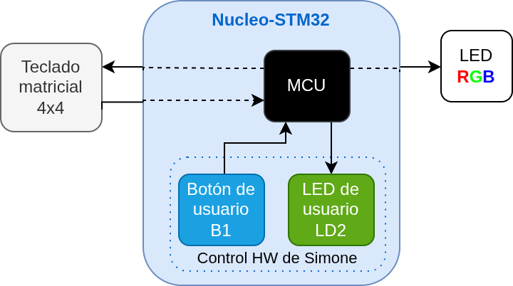B1, y el LED de usuarioLD2. Estos conforman el sub-sistema de control básico. El botón se usará para detectar pulsaciones que el sistema central interpretará para cambiar encender/ apagar, u otras implementaciones que el quieras hacer en Versión 5. El LED de la placa podrá usarse para saber si hemos realizado correctamente una operación, a modo de feedback. -