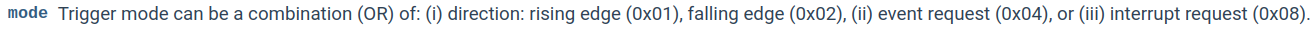 RTSR(rising) si el valor de la variablemodees0x01, indicando que la interrupción ha de notificarse cuando ocurra un flanco de subida.El número del pin,
