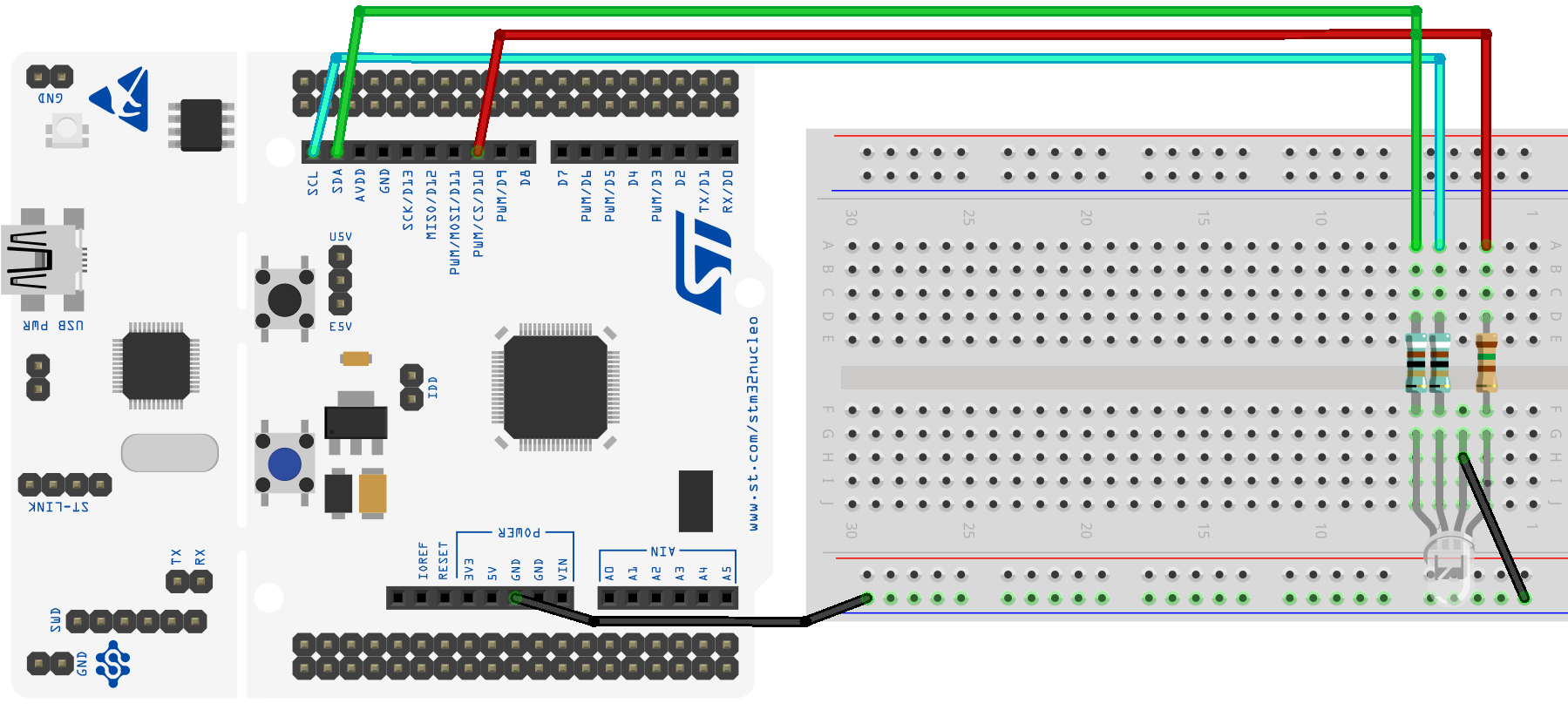 Vamos a implementar el contrato con el usuario de la parte dependiente del HW de librería del RGB light. Esta es la interfaz que vamos a proporcionar al usuario para que pueda usar la librería y añadir LEDs RGB como necesite. Vamos a portar las funciones necesarias para usar la librería, cómo no, para la placa Nucleo-STM32F446RE. Comenzaremos de nuevo por la cabecera y luego los códigos fuente. El montaje de nuestro LED RGB con la Nucleo-STM32F446RE se muestra en la figura.