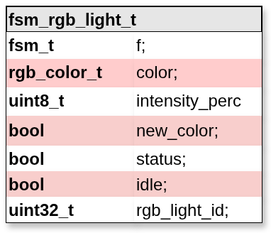 La parte COMMON de nuestra librería trabaja con la estructura (struct) pública que se muestra en la figura (c) fsm_rgb_light_t. El tipo de esta estructura está declarada en el fichero fsm_rgb_light.h.
