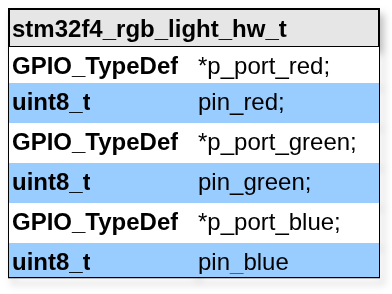 stm32f4_rgb_light_hw_t, que contiene en sus campos los puertos y pines de cada GPIO. Presta atención a la API. -