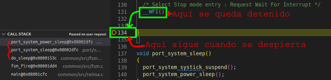 __WFI()), similar a como se muestra en la . Esto querrá decir que, efectivamente, la ejecución estaba detenida esperando una interrupción, se ha despertado, y ha pasado a la siguiente línea de código.